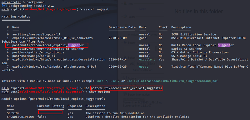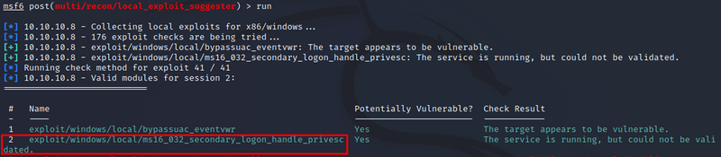 Once the suggester runs, I find what I’m really looking for which is a way to privilege escalate from the “Kostas” user to the system authority/root