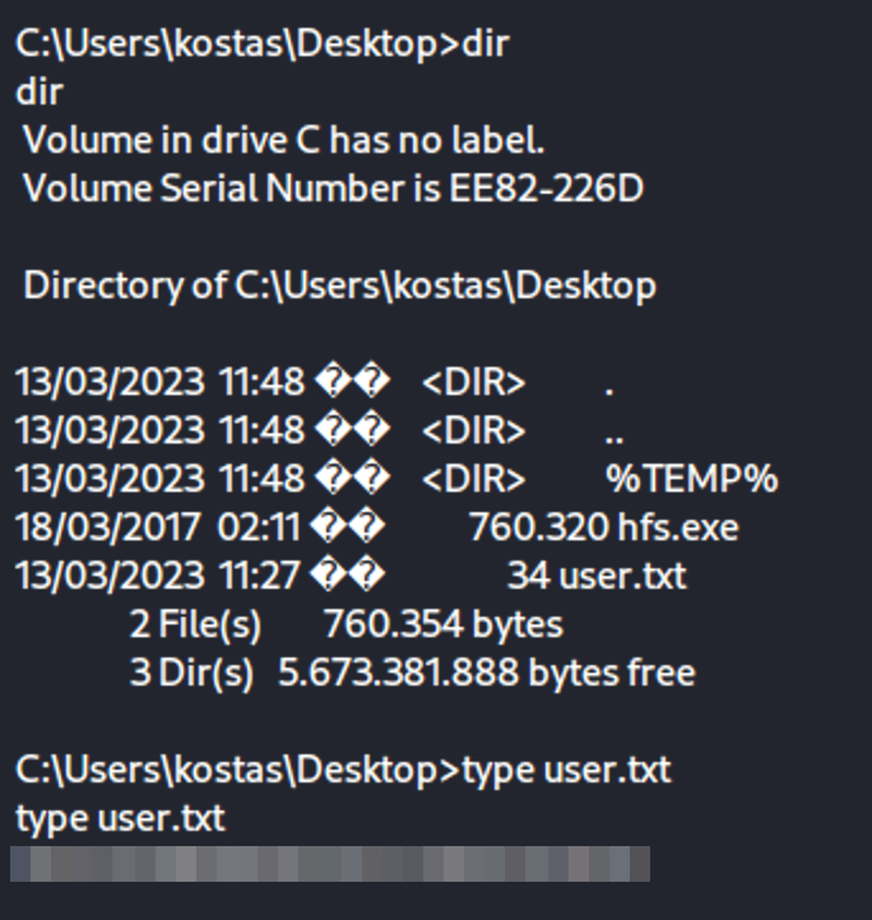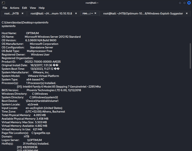 In order to prepare the database and system info I run systeminfo command using the foothold of the Kostas user