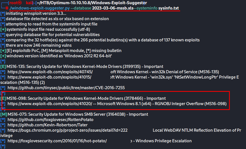 I used https://github.com/Glyph-Research/Windows-Exploit-Suggester.git which as its name implies suggests exploits based on system info