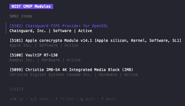 Terminal UI for browsing and searching NIST CMVP validated modules.